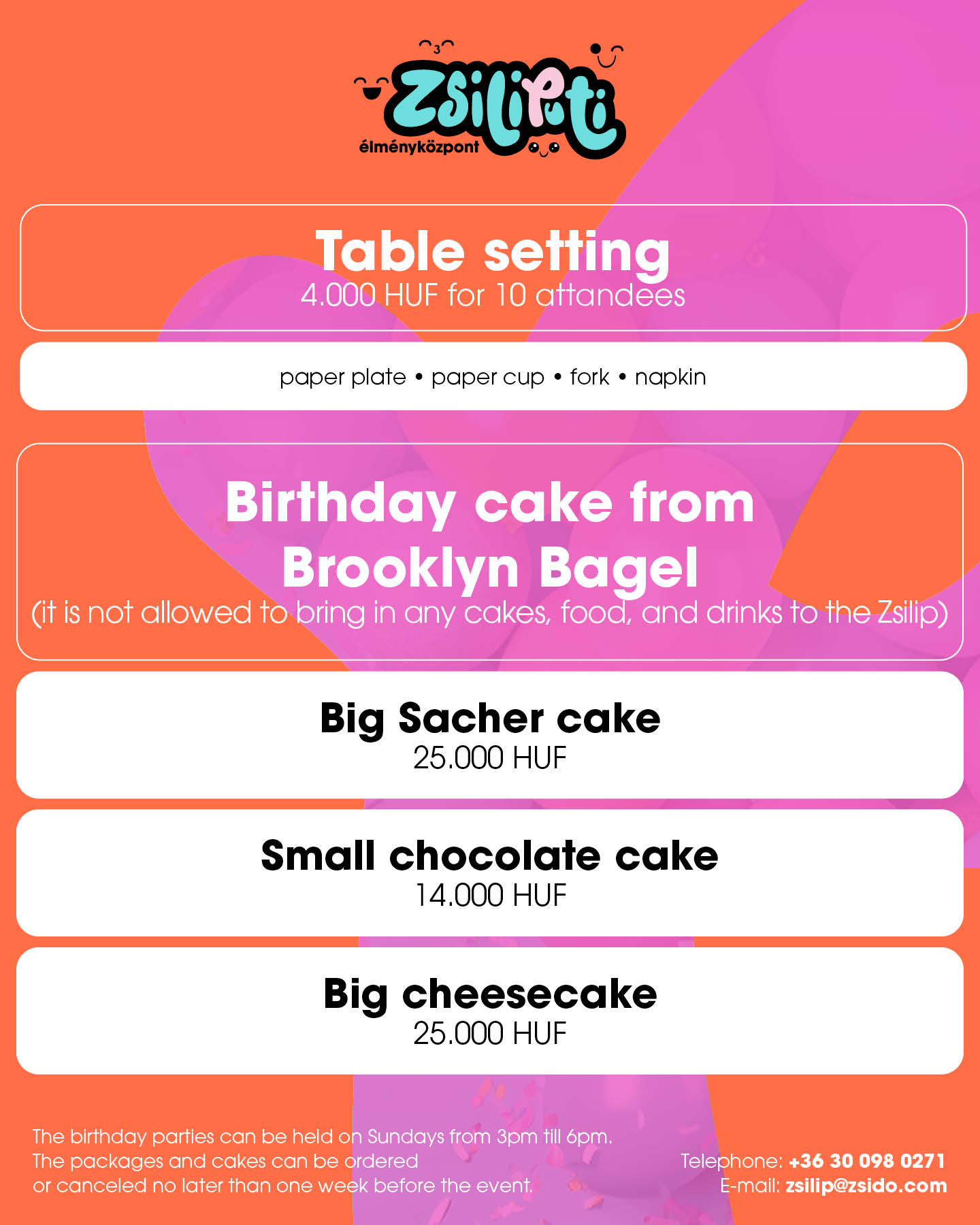 Amennyiben születésnapi party-t szerveznél gyermekednek, a részletekről kérjük érdeklődj az alábbi elérhetőségek egyikén: